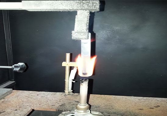 將長方形條狀試樣的一端固定在水平或垂直夾具上,其另一端暴露于規(guī)定的試驗(yàn)火焰中。通過測量線性燃燒速率,評價試樣的水平燃燒特性;通過測量其余焰和余灼時間、燃燒的范圍和燃燒顆粒滴落情況,評價試樣的垂直燃燒特性。