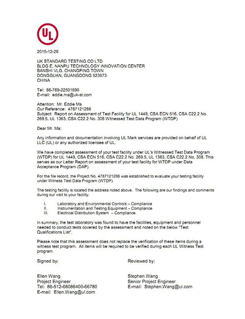 廣東優(yōu)科檢測實(shí)驗(yàn)室獲得UL美華認(rèn)證公司授予的壓敏電阻UL1449、移動(dòng)式電源拖線排插UL1363免目擊實(shí)驗(yàn)室資格,可提供壓敏電阻和移動(dòng)式電源拖線排插UL認(rèn)證及測試服務(wù)。